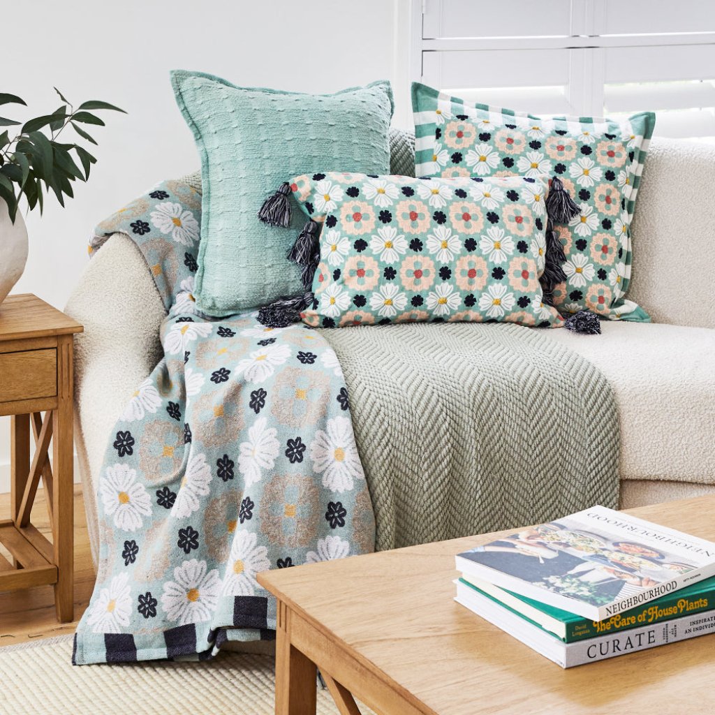 Crafted from cotton in peppermint and white, it is available in two sizes: 35 x 55 cm or 50 x 50 cm.